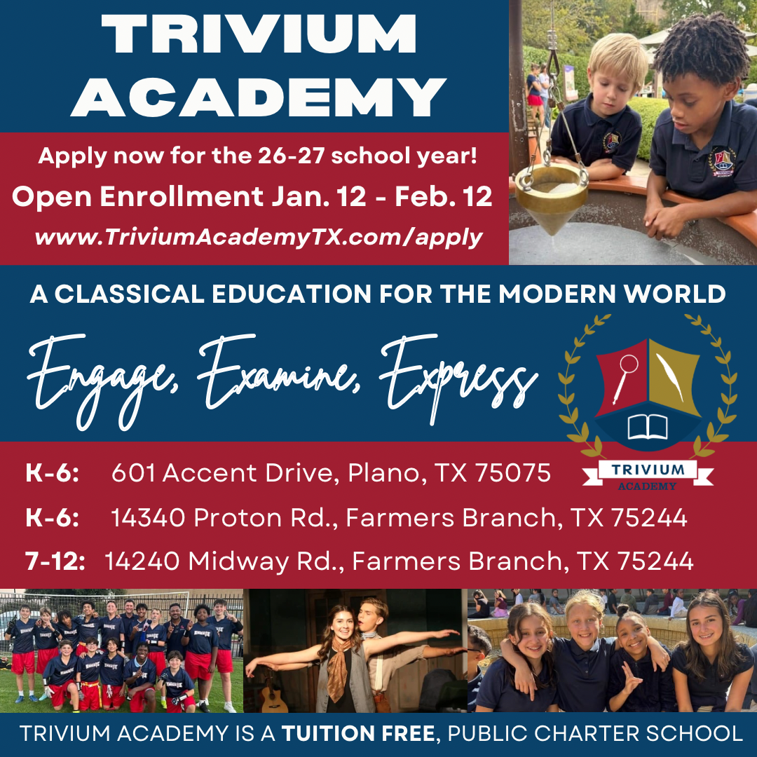 Notice: A parent of student enrolled at Trivium Academy is entitiled to review all teaching materials, instructional materials, and other teaching aids used in the classroom of the parent’s child, inclduding while the child is participating in virtual or remote learning, and may request that the school make the materials available for review as provided by TEC 26.006.